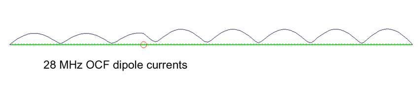 Notice the offset feedpoint does not distort the current distribution along the wire. Current is maximum at the center and minimum at the open ends. This means the feedpoint impedance is lowest at the center, with current increasing towards the ends. The impedance, if we break and feed the antenna with a two-wire source, is about 50-70 ohms at the center and very high (but not infinite) at the ends. By offsetting the feedpoint from the center we can increase the feedpoint impedance without upsetting current distribution or antenna pattern. The same "dipole" operated on 14 MHz (the 4th harmonic) shows four current peaks, or four "low impedance" areas along the antenna: